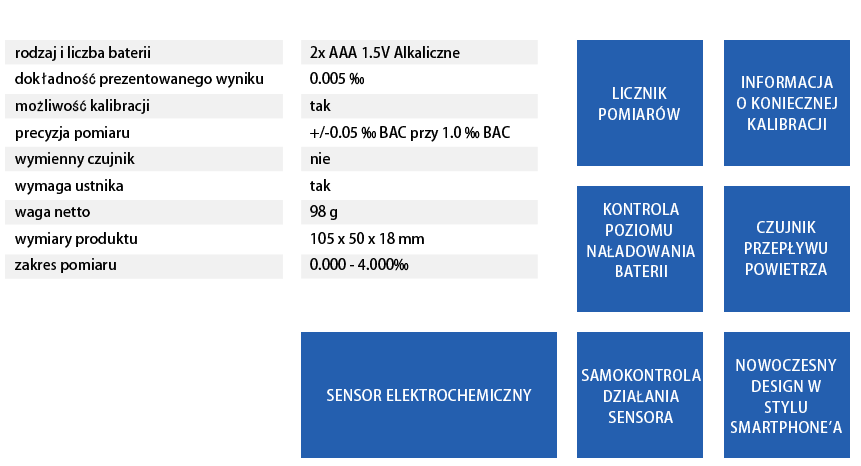 Dzięki zastosowaniu nowego sensora technologia „policyjna” może trafić w ręce użytkownika indywidualnego. Dodatkową zaletą nowoczesnej technologii jest rzadsza kalibracja – zaleca się kalibrować alkomat co 1000 testów. Funkcje alkomatu: licznik wszystkich wykonanych pomiarów, weryfikacja prawidłowego działania czujnika, kontrola przepływu powietrza.