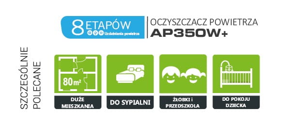 Oczyszczacz powietrza AP350 należy do najnowocześniejszych urządzeń poprawiających jakość powietrza w pomieszczeniach do 80m2: oprócz wyjątkowo sprawnej filtracji zanieczyszczonego powietrza, AP350 posiada funkcję jonizatora i nawilżacza. To czyni oczyszczacz AP350 kompleksowym urządzeniem, które dba o zdrowie i komfort życia alergików, astmatyków, palaczy, oraz osób uskarżających się na dolegliwości związane z coraz powszechniejszym zjawiskiem smogu.