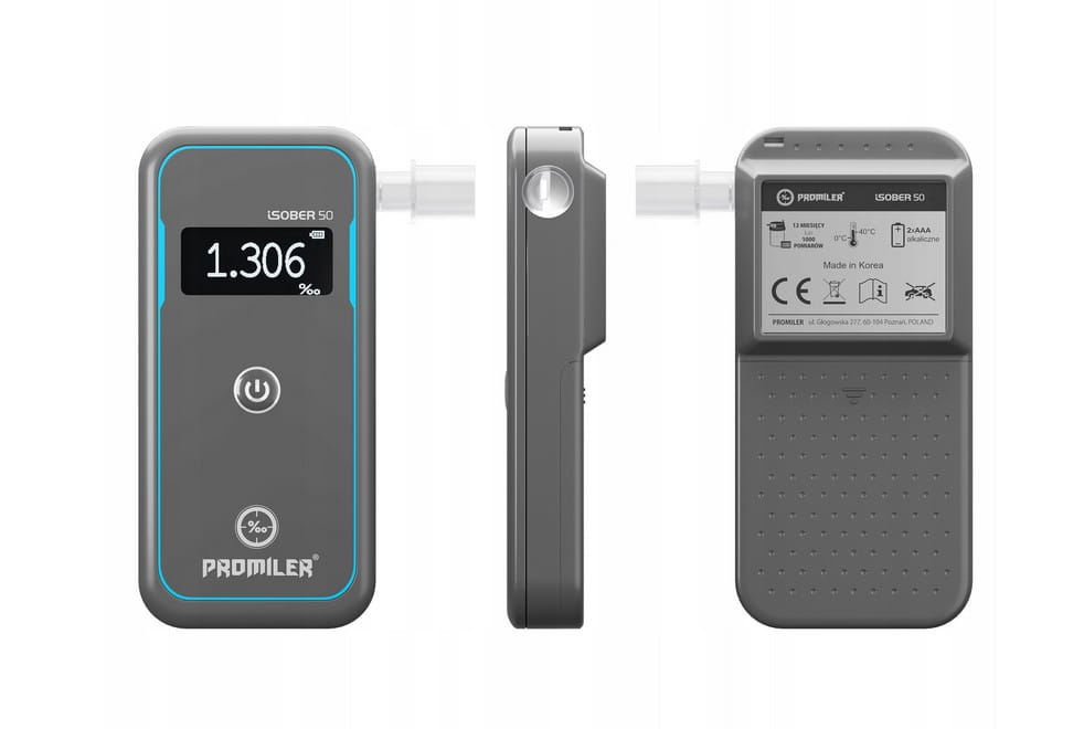 Alkomat PROMILER iSOBER 50 to najnowocześniejszy model w ofercie PROMILER, który łączy w sobie zaawansowaną technologię i niezrównaną precyzję, gwarantując błyskawiczne i dokładne wyniki. Urządzenie wyposażone jest w platynowy sensor Qmol 4.0, zapewniający dokładność pomiaru na poziomie +/- 0,06 ‰ przy 1,00 ‰. To technologia stosowana w profesjonalnych alkomatach – teraz dostępna dla każdego!