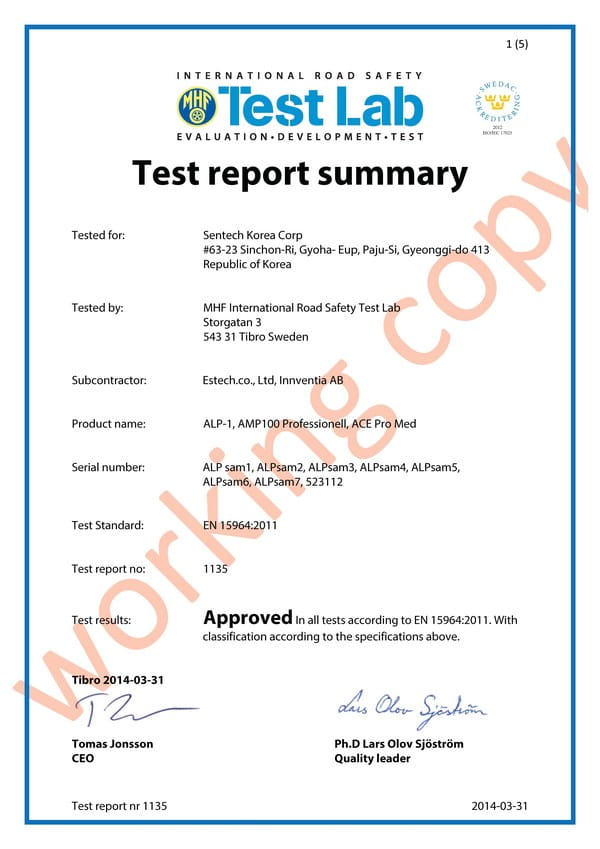 W 2014 roku alkomat ALP-1 otrzymał certyfikat zgodności z normą europejską EN15964 wydany przez laboratorium w Szwecji.