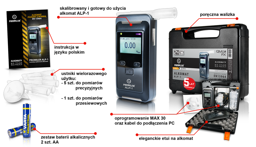 Profesjonalny alkomat ALP-1 oferuje najwyższą jakość pomiaru. Po przejściu procedury wzorcowania ALP-1 może być również alkomatem dowodowym. Urządzenie marki Promiler świetnie sprawdza się do przeprowadzania badań przesiewowych, w związku z tym spełnia wyśrubowane wymogi policji i innych służb mundurowych. Alkomat zrobił również zawrotną karierę w służbach mundurowych za granicą – jest używany m.in. w Stanach Zjednoczonych i Japonii.